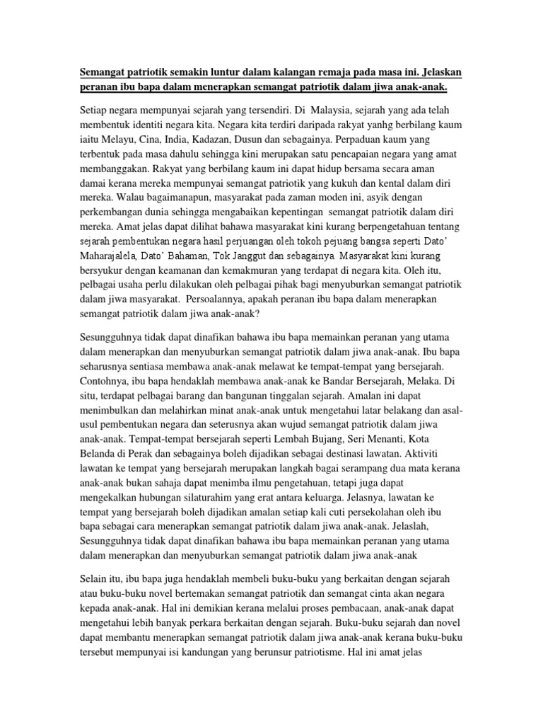 Semangat nasionalisme dan patriotisme diwujudkan dengan mematuhi aturan yang berlaku, mematuhi hukum negara, melestarikan budaya indonesia, menciptakan dan mencintai produk dalam negari, serta bersedia melakukan aksi nyata membela negara. Pada pendapat anda, bagaimanakah caranya untuk memupuk semangat patriotisme di kalangan remaja hari ini? Bagaimana cara langkah memupuk semangat patriorisme generasi muda remaja di malaysia. Cara memupuk semangat cinta akan negara dalam kalangan pelajar. Kesimpulannya, cara untuk memupuk semangat patriotisme perlulah dijalankan sepanjang masa tanpa henti. Sinarkah semangat patriotisme dalam kalangan mahasiswa punca luntur semangat patriotisme definisi patriotisme pengaruh budaya global. Contoh karangan spm memupuk semangat kejiranan dalam kalangan masyarakat. Oleh itu, terdapat pelbagai ciri seorang remaja yang mempunyai semangat patriotisme yang tinggi. We are a sharing community. Jika kita tinggal di satu taman atau di sebuah kampung yang sama. Hal ini demikian kerana dapat melahirkan warganegara yang cinta akan negara dan menjadi individu yang berguna kepada bangsa dan negara. Tanpa kita sedar patriotisme memainkan peranan yang sangat penting dalam diri setiap rakyat malaysia. Mutakhir ini semangat patriotik dalam kalangan generasi muda semakin pudar.