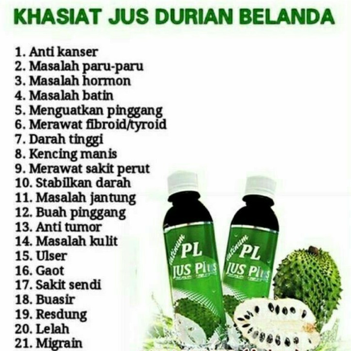 10,000 kali lebih kuat dari kemoterapi. Saya adalah pengedar rasmi jus annona untuk pasaran online. Saya telah menjadi pengedar jus annona, kejaiban dari durian belanda semenjak jus annona di pasarkan. Bukan sahaja buahnya, malah daun durian belanda juga dikatakan mempunyai banyak manfaat kesihatan untuk kita. Membunuh sel kanser mencegah osteoporosis (membina tulang yg kuat) meningkatkan tenaga dan daya tahan bermanfaat. Kali ni bonda menulis dr dlm kapal terbang ttg durian belanda. Durian belanda adalah makanan yang selalu diambil oleh kita. Agustus 13, 2017agustus 13, 20170 views. Jus/pati/isi buah jomdurianbelanda.com kami cod di sekitar lembah klang atau self pick up di shah alam untuk membuat pesanan, wasap www.wasap.my/601121073486. Keistimewaan & khasiat pati jus durian belanda organik annona. Khasiat durian belanda asli 100% tanpa campuran gula dan pengawet. Daun durian belanda adalah pembunuh semulajadi sel kanser yang ajaib dengan 10,000 kali lebih kuat dari pada terapi kemo. Banyak khasiat buah durian belanda yang masih menjadi rahsia atau di rahsiakan.tahukah anda durian belanda ini sebagai agen yang berkesan dan kuat dalam mematikan kanser dalam badan kita.